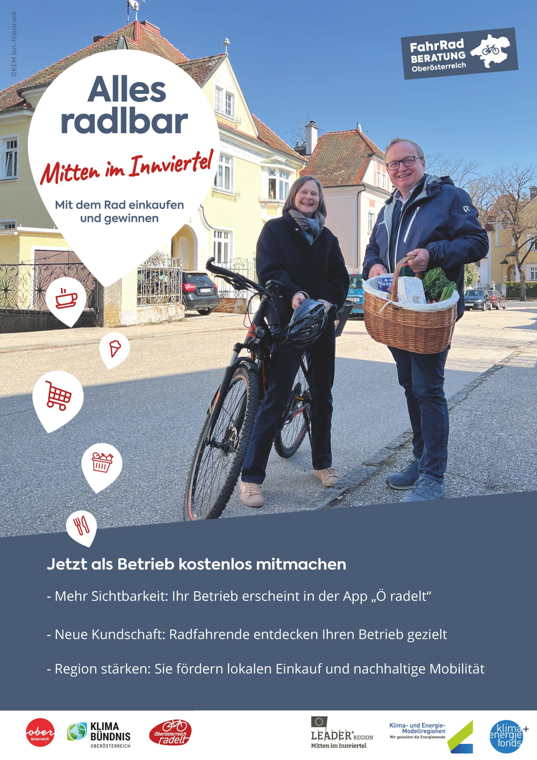 Bürgerinnen und Bürger werden eingeladen, ihre Einkäufe mit dem Fahrrad zu erledigen und dabei gezielt regionale Betriebe zu besuchen. Radfahrende können durch ihre Teilnahme an der Aktion attraktive Preise von den Klima- und Energie-Modellregionen Inn-Hausruck und Inn-Kobernaußerwald sowie der LEADER-Region Mitten im Innviertel gewinnen.