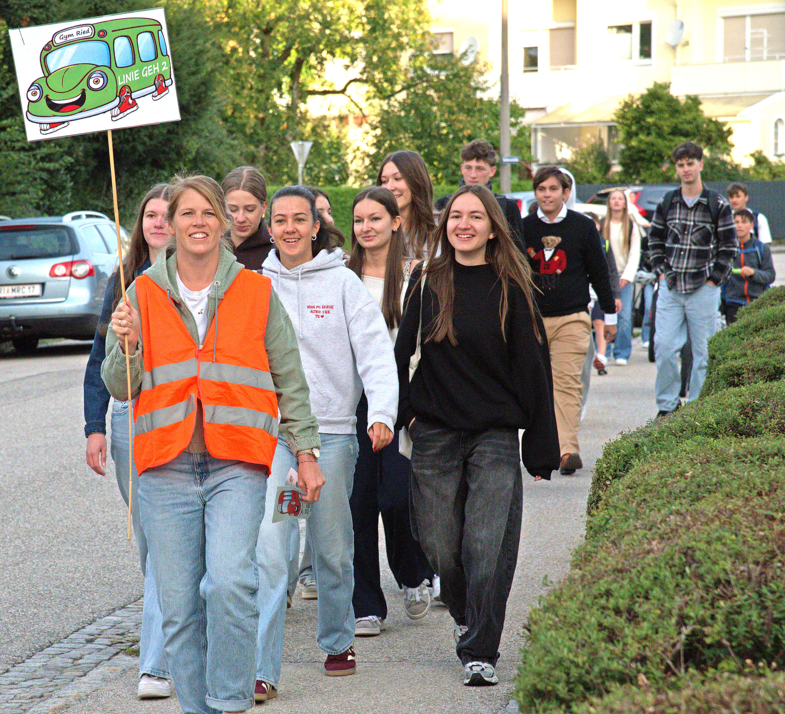 Darüber hinaus setzten die Schüler:innen im Rahmen der Europäischen Mobilitätswoche ein kreatives Zeichen für mehr Lebensqualität: Der Schatzmannsdorfer Platz wurde liebevoll in einen „Blühenden Platz“ verwandelt – als Symbol für die Aufwertung des urbanen Raums. Am Gymnasium Ried wurde im Rahmen der Mobilitätswoche ein Klimatag organisiert, bei dem die Straße vor der Schule gesperrt war: Ein Fahrradparcours lud zum Mitmachen ein, die Fläche wurde kreativ gestaltet, und beim sogenannten „Pedibus“ legten Schüler:innen gemeinsam mit ihren Lehrkräften den Schulweg zu Fuß zurück.