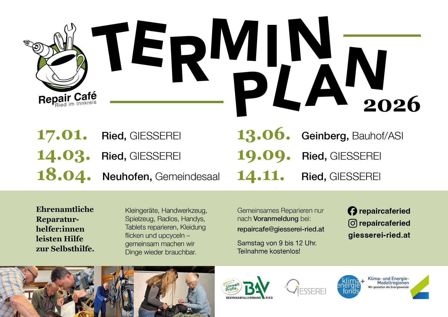Anmeldung bis 15.04.2026 per E-Mail an repaircafe@giesserei-ried.at (mit Bekanntgabe des Reparaturfalles)